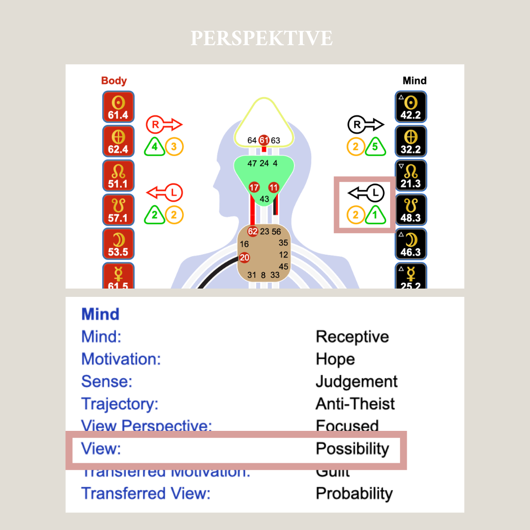 Deine Perspektive leitet sich von deinem bewussten Nord- und Südknoten ab (das dritte und vierte Symbol in der rechten Spalte). Das bedeutet, dass du dir diese beiden Tore anschauen und deine Perspektive auch auf diese Themen beziehen kannst. Im obigen Bildbeispiel wären dies die Tore 21 und 48 mit der Perspektive “Möglichkeiten”. Das bedeutet, dass diese Person die Möglichkeiten sieht, wie oder wo sie die Kontrolle übernehmen und wie sie mit Ressourcen umgehen kann (Tor 21) und auch wo sie überall noch tiefer gehen und ihre Fähigkeiten erweitern kann (Tor 48). Und da beide Tore in der Linie 3 stehen, ist diese Person da, um dabei viele Erfahrungen zu machen und zu erkennen, was davon funktioniert und was nicht.